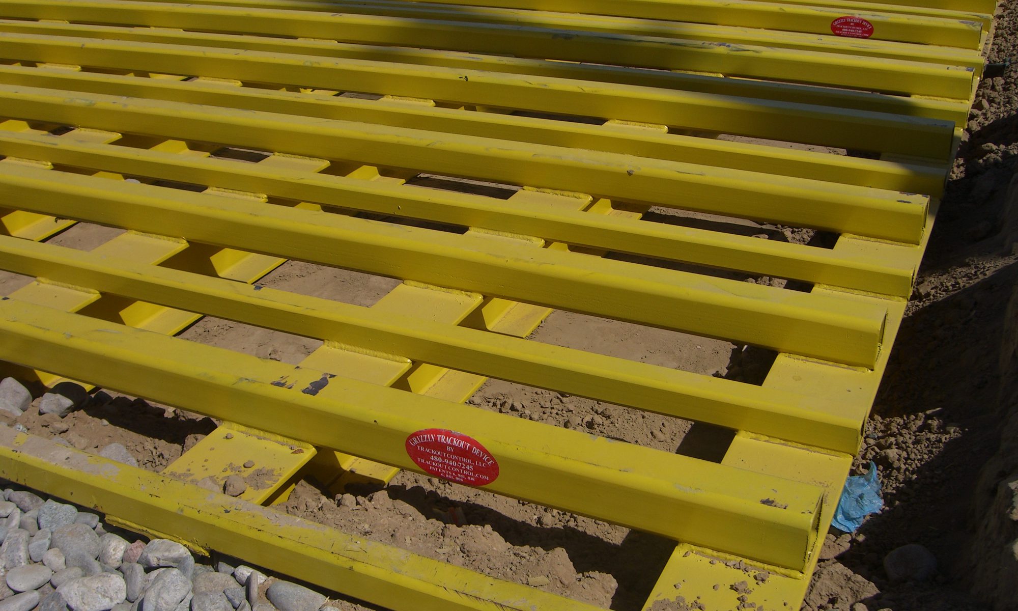 The Grizzly® and RuMble Grate® are patented and trademarked products and have a patented methodology. Before the invention of the of the Grizzly® and the RuMble Grate® (or the subsequent various knock-off copies of the product existed), only gravel pads were used to control track out. In late 2002, the Grizzly® and the RuMble Grate® were created. RuMble Grates® were introduced in Arizona, Nevada and California in 2003 on construction sites. Since then it has spread across the country as the simplest and most economic way to minimize track out for construction sites, landfills, power plants, batch plants and manufacturing applications. After introduction Very quickly various “patent infringing knock-offs” were being built to copy the rumbling effect of the Grizzly® and the RuMble Grate®. The methodology in the form of rumble strips, steel plates and products under various names, The knock-offs without our proprietary dimensions, had very limited actual performance, as compared to the Grizzly® and the RuMble Grate®. The Grizzly® brand RuMble Grate® has collection space underneath which collects the dust, dirt and rock in dead-fall space when falling off the vehicle. It uses no water or electricity but provides 85% effective removal and collects the solid materials in the dead-fall space below the RuMble Grate®.